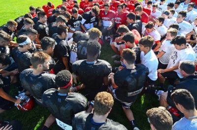 Members of the St. Thomas More Knights varsity, junior varsity and Grade 8 football teams gather on the field prior to practice Monday in a prayer for head coach Bernie Kully who died Saturday. Photograph By CORNELIA NAYLOR
